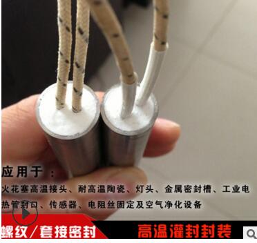 一般用于高溫用途,耐溫可到500度,高的可到1500度。比如高溫套接密封,法蘭連接處高溫密封,這種無機高溫膠往往需要加熱固化,強度不算高,做一般的填充密封和固定定位的較多。很多高溫傳感器、高溫過濾器、單頭電熱管、電廠焚燒爐、冶煉廠高溫爐等應用較為廣泛。例如電熱管封口使用的: