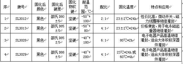 上表中的SL3029黑色灌封膠的耐溫短時間,可以到200度長期,短時間能耐溫到250度,而且可以常溫或中溫固化,這在灌封膠中不多見,很有特色。