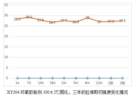 XY304環(huán)氧膠粘劑的耐老化有19.6年的實測數(shù)據(jù)。鑒于現(xiàn)在軍工用膠粘劑品種有新增且部分原材料供貨廠家也發(fā)生了變化,為了真實了解這些材料的耐老化情況,我們將公司的環(huán)氧類型的膠粘劑產(chǎn)品做了一個25年老化的計劃,并于2018年元月開始,預計整個試驗到2043年結束。