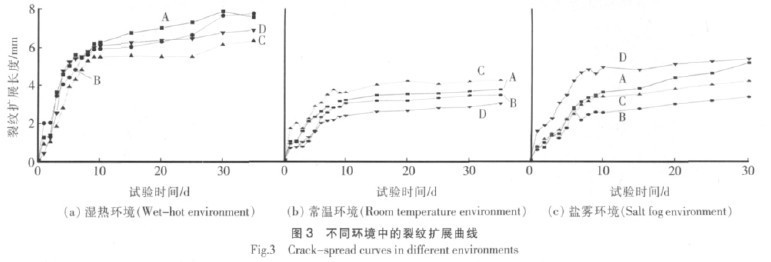 依次為 D>A>B>C; 常溫環(huán)境中,種規(guī)格膠粘劑的裂紋擴展由快到慢依次為 C>A>B>D 鹽霧環(huán)境中,種規(guī)格膠粘劑的裂紋擴展由快到慢依次為 D>A>C>B。