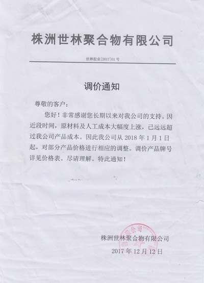 您現(xiàn)在的位置:世林膠業(yè)首頁(yè) - 資訊大全 - 世林膠業(yè)2018年1月調(diào)價(jià)通知