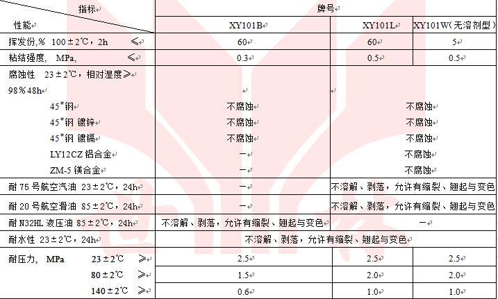XY101各型密封膏為不干性粘彈型液態(tài)密封墊,它具有耐水、耐水與乙二醇或水與甲醇的混合物,耐汽油、噴氣燃料、礦物油、合成潤滑油、耐渦輪發(fā)動機燃燒產(chǎn)物等,它適合于航空發(fā)動機的附件機匣與壓氣機機匣結(jié)合面、附件機匣與附件安裝面等處的密封。也適合于其它發(fā)動機、大型機械或設(shè)備的相關(guān)部位密封。通常其密封間隙應(yīng)小于0.04mm。但不適合于大間隙以及薄壁焊接件及沖壓件的結(jié)合面密封,也不適于帶坡度的結(jié)合面密封。其工作溫度為-50~+250℃,短期可達(dá)300℃。
